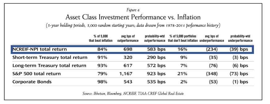Further, commercial real estate performance for five-year holding periods has beaten inflation over those same periods with 84 percent probability, as shown in the table below.